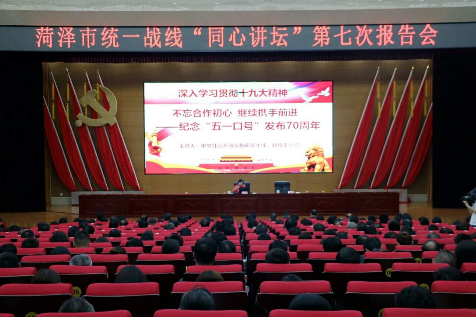 4月25日下午,菏投集團黨委副書記郭菏玉,菏投集團總經(jīng)濟師、九三學社菏澤市委副主委王慶英參加了市委組織部、市委統(tǒng)戰(zhàn)部在市委黨校報告廳舉辦的菏澤市統(tǒng)一戰(zhàn)線“同心講壇”報告會。特別邀請中央社會主義學院統(tǒng)戰(zhàn)理論教研部參政黨教研室主任王小鴻作深入學習貫徹十九大精神,“不忘合作初心 繼續(xù)攜手前進——紀念‘五一口號’發(fā)布70周年”專題報告。市委常委、統(tǒng)戰(zhàn)部部長王永華主持報告會并講話。
