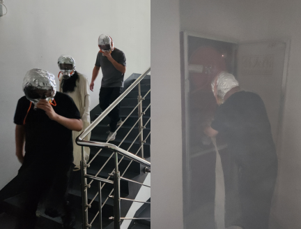 在演練活動現(xiàn)場,模擬8樓衛(wèi)生間處突發(fā)火災,集團各樓層各部室隨即啟動應急預案,撲救組按動火災警鈴并進行撲救,疏散組進行引導疏散。員工在疏散過程中,彎腰低頭,用消防自救呼吸器或濕毛巾捂住口鼻,快速有序地從安全通道疏散樓梯向底層進行撤離,最終撤離至辦公大樓前的安全地帶并進行人數(shù)清點。