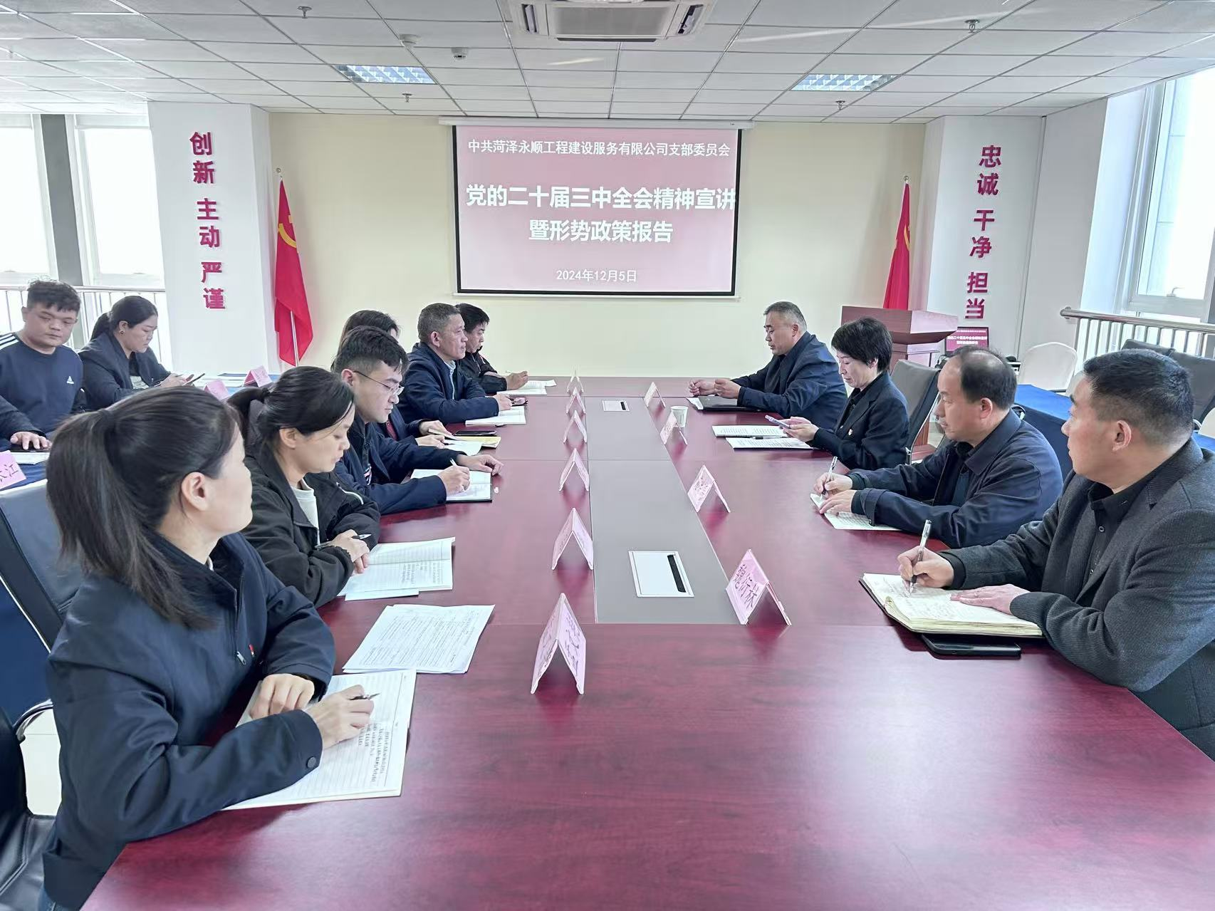 為深入學(xué)習(xí)貫徹黨的二十屆三中全會(huì)精神,12月5日,菏澤投資集團(tuán)黨委委員、副總經(jīng)理、總審計(jì)師張戰(zhàn)勝到永順工程黨支部作黨的二十屆三中全會(huì)精神宣講暨形勢(shì)政策報(bào)告。永順工程黨支部全體黨員、中層正職及以上人員參加。