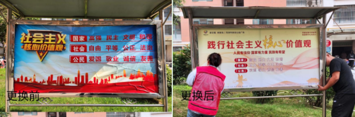 經(jīng)過(guò)前期開(kāi)展的老舊、破損公益廣告全面排查,針對(duì)小區(qū)主次干道、廣場(chǎng)、宣傳欄等長(zhǎng)期裸露在外、因風(fēng)吹日曬等原因造成褪色、破損、殘缺的公益廣告進(jìn)行“全覆蓋”提檔升級(jí)。此次提綱升級(jí)公益廣告牌共計(jì)18塊,并對(duì)墻面、電線桿上野廣告、“牛皮癬”進(jìn)行了清除。