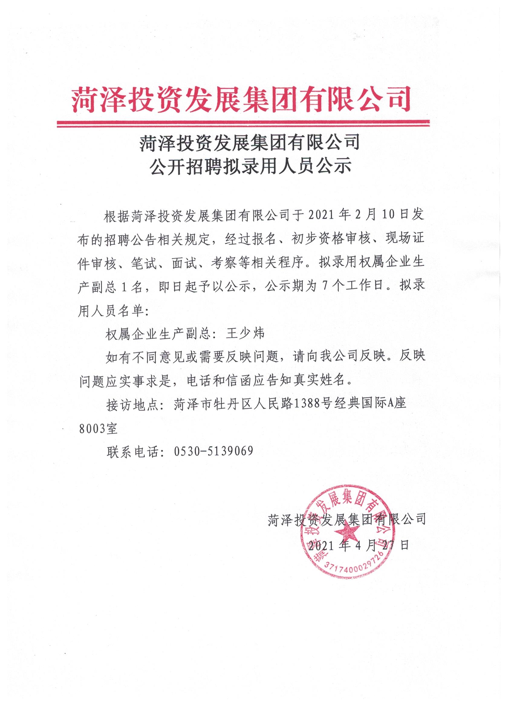 菏澤投資發(fā)展集團有限公司公開招聘擬錄用人員公示