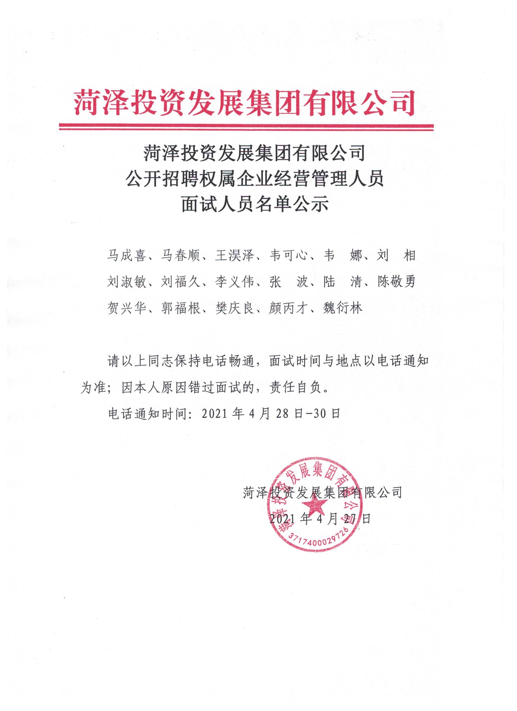 菏澤投資發(fā)展集團有限公司公開招聘權(quán)屬企業(yè)經(jīng)營管理人員面試人員名單公示