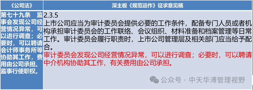根據(jù)《公司法》約定,監(jiān)事會(huì)有權(quán)審查并監(jiān)督公司財(cái)務(wù)狀況,并有對(duì)董事與高級(jí)管理者監(jiān)督的權(quán)力。其實(shí)這個(gè)權(quán)力在原《公司法》中也部分的授予了審計(jì)委員會(huì),但是在取消監(jiān)事會(huì)之后,這個(gè)權(quán)力就完全轉(zhuǎn)移到了審計(jì)委員會(huì)。這一條在深主板《規(guī)范運(yùn)作》征求意見稿中得到了明確的要求。