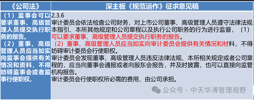 根據(jù)《公司法》的約定,為了監(jiān)督董高人員的履職狀況,監(jiān)事會(huì)有權(quán)要求董高人員提供履職報(bào)告的權(quán)力。當(dāng)監(jiān)事會(huì)取消后,這項(xiàng)權(quán)力就全部轉(zhuǎn)移給審計(jì)委員會(huì)。這一條在深主板《規(guī)范運(yùn)作》征求意見稿中得到了明確的要求。