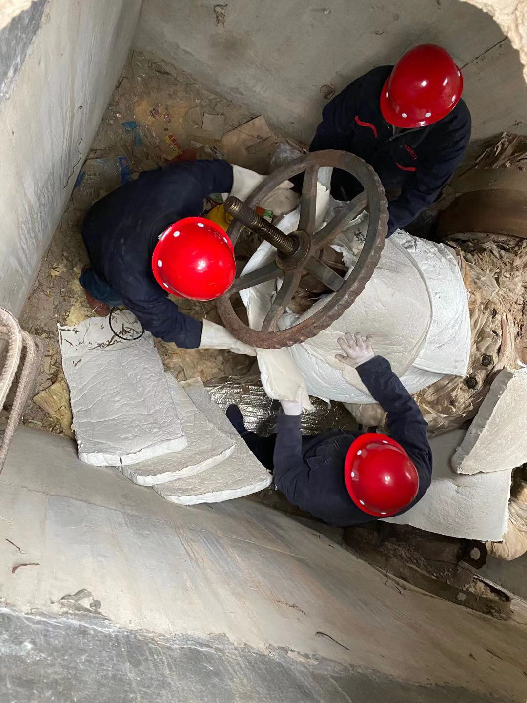 寒冬臘月,井內卻熱浪翻滾。井下作業(yè)人員不斷的用小型噴壺噴灑冷水降溫,其余人抓緊時間拆除破舊保溫材料,換上新的巖棉。三班兩倒,五分鐘一換,分工合作,有條不紊。任務艱巨,條件惡劣,工作不易。盡管如此,所有閥門井的破舊保溫材料還是按照計劃時間全部換新,圓滿完成了保溫修復任務。