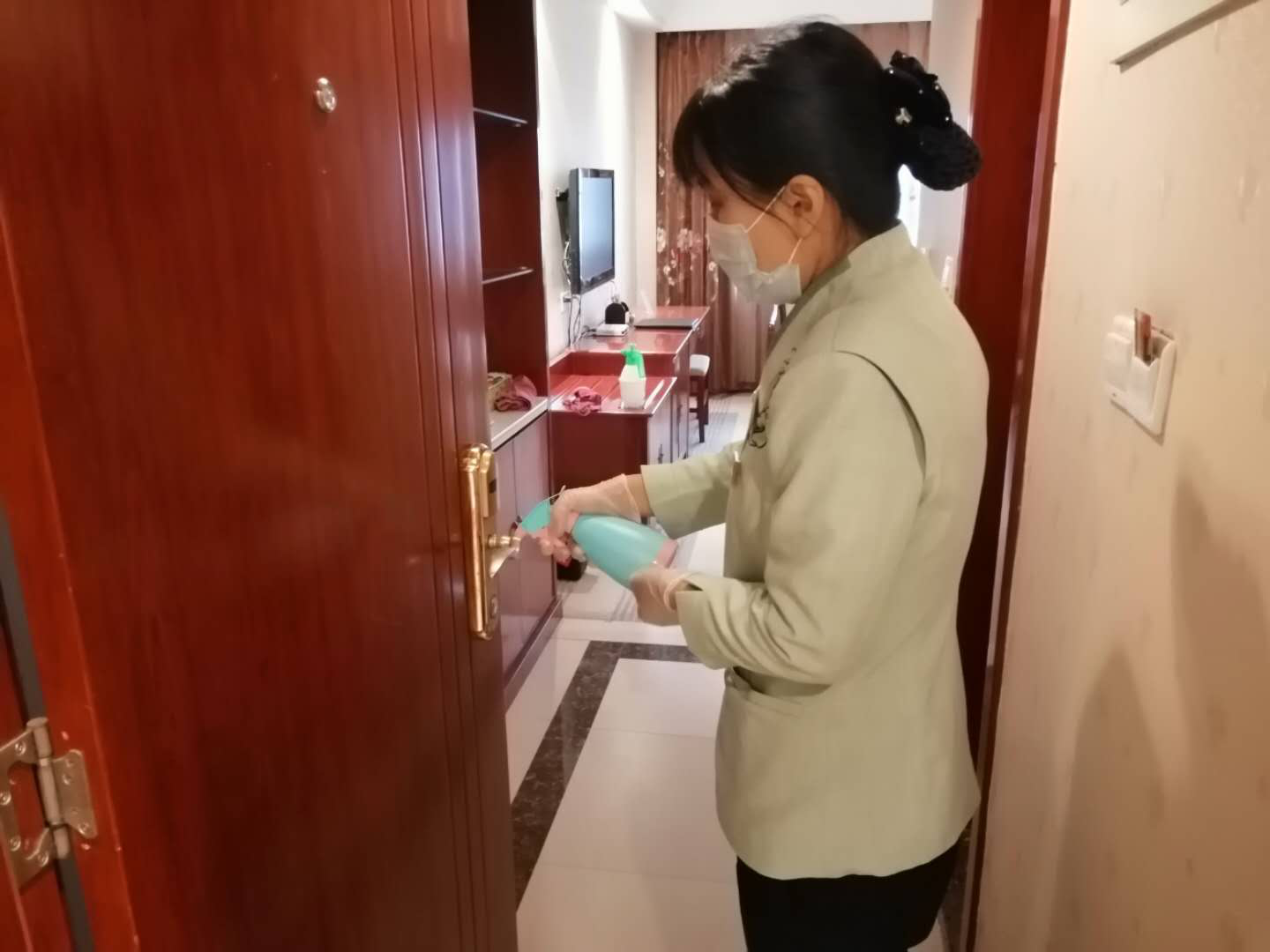 客房每天通風(fēng)兩次,每次三十分鐘,客用物品一客一用一消毒,工作人員對(duì)客房門(mén)把手消毒。