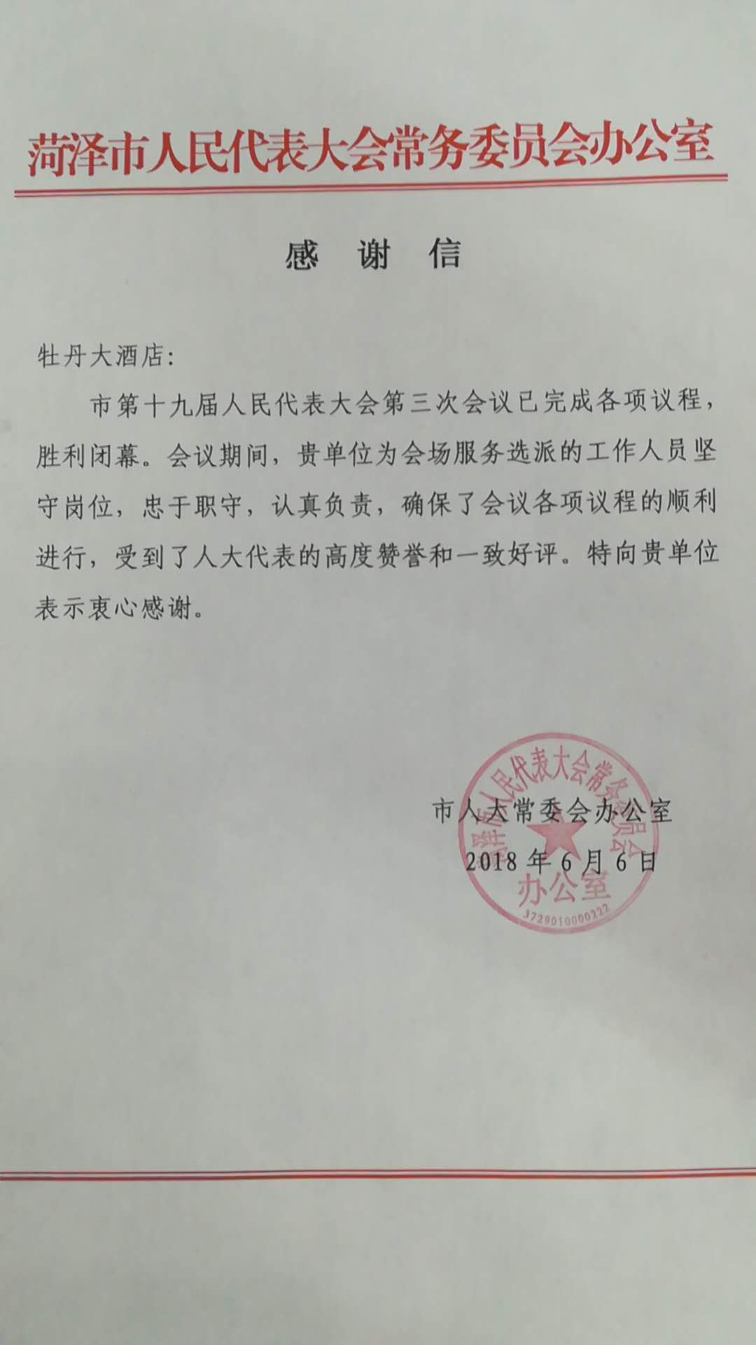 牡丹大酒店圓滿完成我市第十九屆人大會第三次會議接待工作