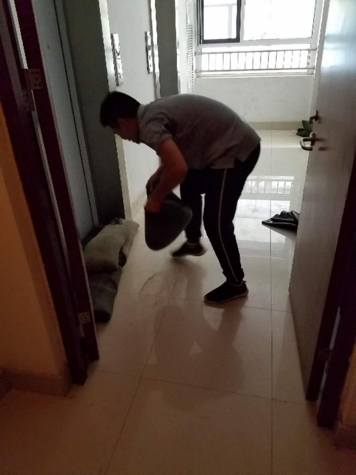 9:09管理員到達(dá)事故現(xiàn)場(chǎng),一方面聯(lián)系魯商鳳凰城分管人員,將電梯升到安全位置,中止運(yùn)行并切斷總電源,一方面快速關(guān)閉樓宇分段閥,并迅速使用沙袋、布單等堵住電梯口,阻止水勢(shì)蔓延到業(yè)主戶內(nèi)及重點(diǎn)區(qū)域,防止電氣短路或水浸漏電,避免造成人身傷亡及由此引發(fā)的電氣火災(zāi)。