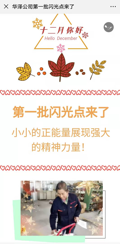 華澤公司第一期發(fā)布了19個(gè)人的閃光點(diǎn),拍攝了照片在宣傳欄張貼,制作了微信小程序在微信群發(fā)布,宣傳活動(dòng)調(diào)動(dòng)了員工參與的積極性,將吸引更多員工的參與。
