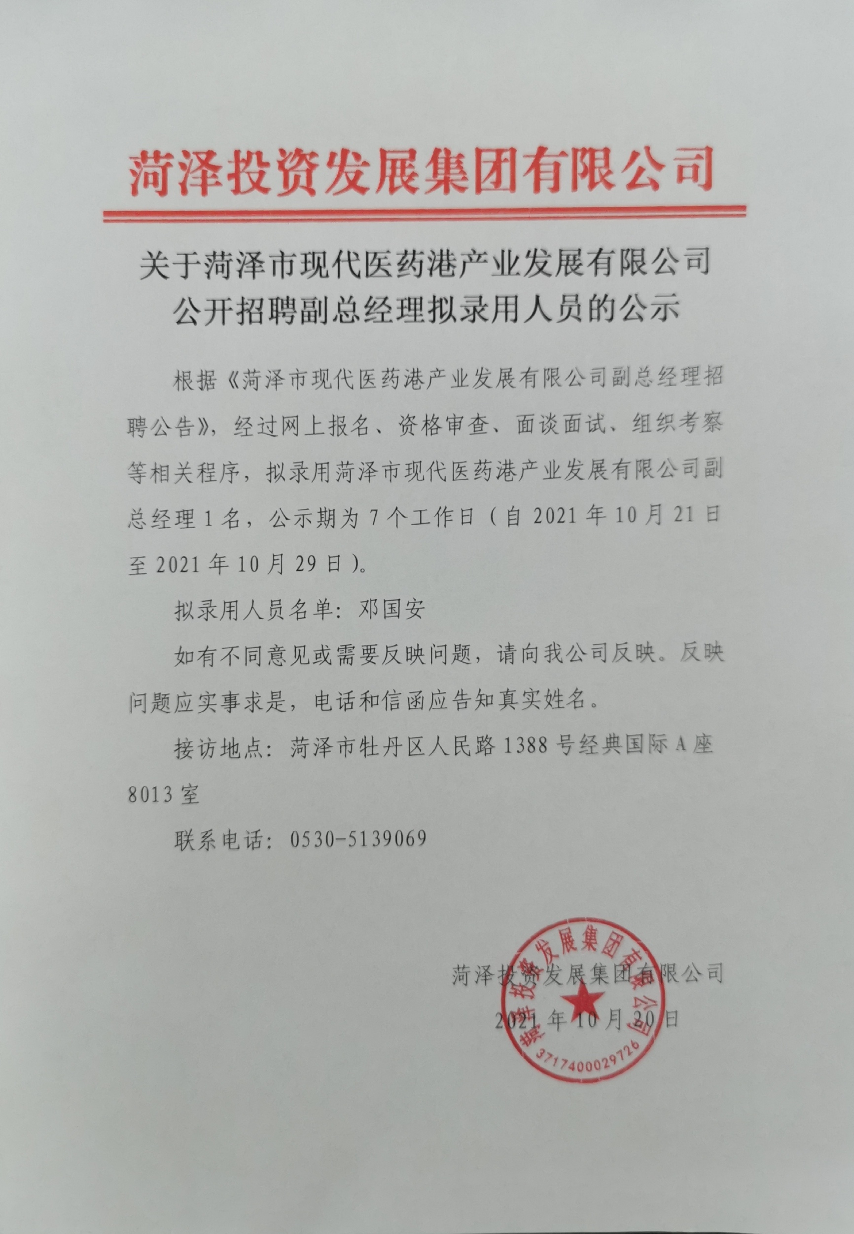 關于菏澤市現(xiàn)代醫(yī)藥港產(chǎn)業(yè)發(fā)展公司公開招聘副總經(jīng)理擬錄用人員的公示